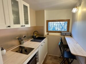Entièrement équipée, vous pourrez y prendre votre petit déjeuner et cuisiner vos repas : réfrigérateur, plaque à induction, four, micro-onde, lave vaisselle, cafetière Senseo.
