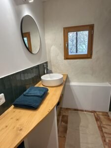 Le gîte bénéficie d’une salle de bain avec douche à l’italienne et d’un WC séparé.